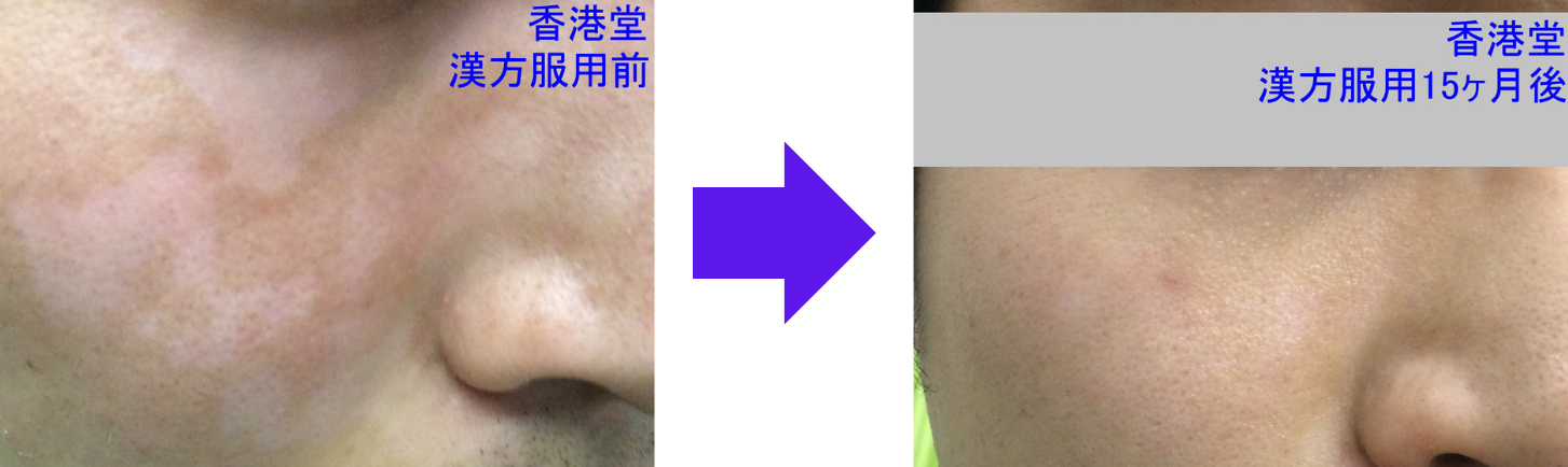 尋常性白斑に香港堂の漢方は効果が期待されます。個人差はありますが、一般的に尋常性白斑の服用期間は1クール約6か月です。6か月で改善変化あれば、さらに続けて治るまで服用する必要があります。当薬局の漢方を飲んでいる方は沢山いらっしゃいます。あきらめないでください!尋常性白斑には根気よく向き合うことが大切です。