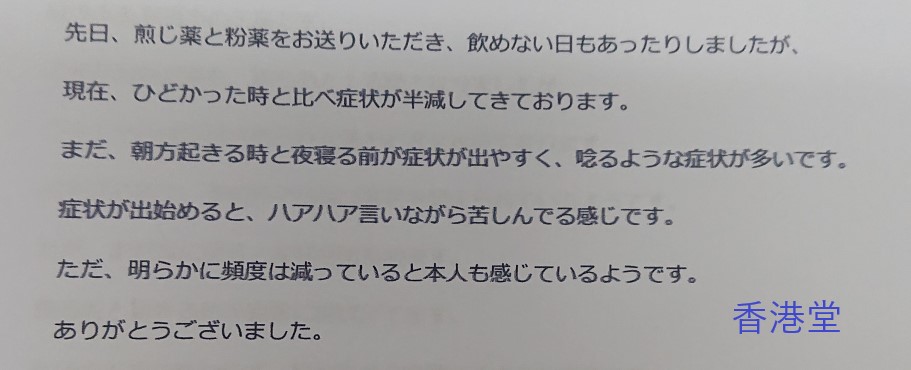 今年1月から、林先生の漢方を服用して、2ヶ月になりますが、あのひどかった痙攣が嘘のように治まってきて、本当に感謝をしております。