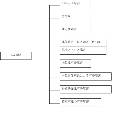 ここに示した分類は、米国精神医学会のDSM-IV-TRによっています。もうひとつの臨床でよく使われる分類基準であるWHOのICD-10では、パニック障害と恐怖症の関係がやや異なることと、一般身体疾患や物質によるものは不安障害からのぞかれている点が異なっていますが、他はほぼ共通しています。